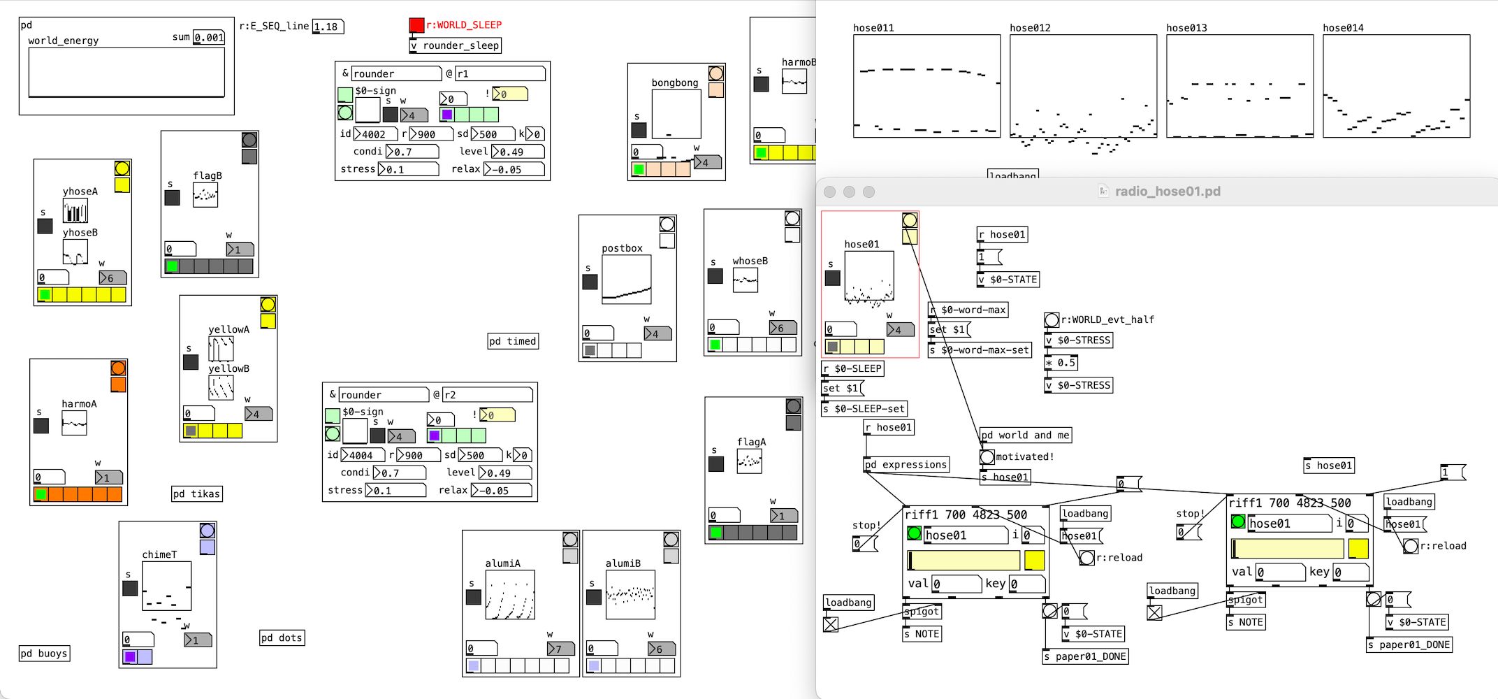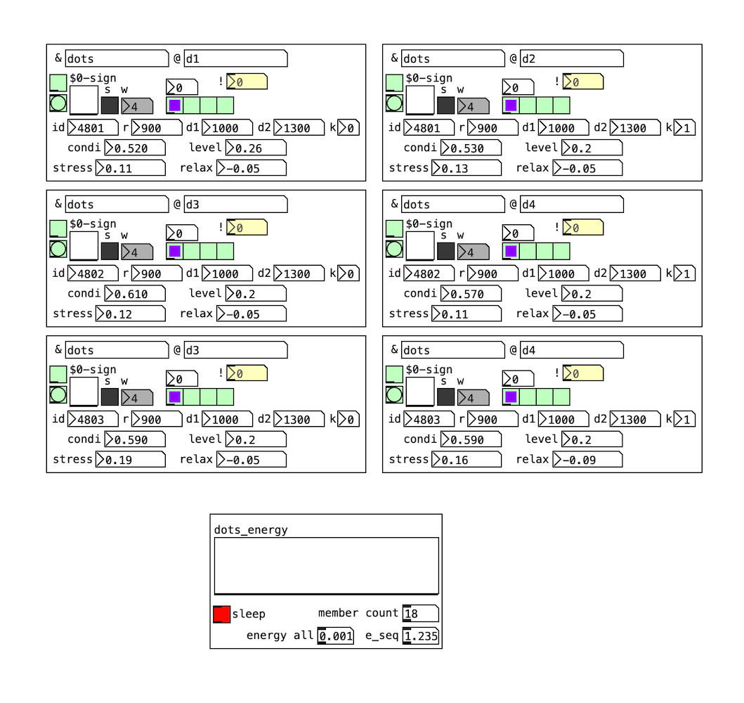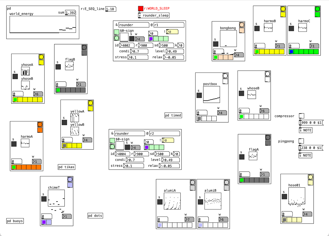 “여러분은 사물들이 소리와 움직임을 스스로 만들고, 사물 생태계의 법칙에 따라 각자의 노동과 일과를 보낼 수 있도록 설계된 소리 환경이자 세계를 만나고 있습니다. 톤Tone, 티카Tika, 찌Buoy, 썬더Thunder, 캐스퍼Casper, 봉봉Bongbong, 도트Dot 등의 다양한 이름을 가지고 있는 사물들은 전시장 벽과 통로, 출입구 곳곳에서 라디오 신호로 서로 소통하며, 분산된 네트워크를 이루고 있습니다. 정기적인 무선 통신으로 사물들은 각자의 상태를 파악합니다. 누가 소리를 내거나, _세계의 에너지_에 영향을 주는지 감지하고, 자신은 언제, 어떻게 모습을 드러내거나 움직일 건지 개체적으로 결정합니다. 우리가 매일 날씨와 밤/낮을 경험하고 인지할 때, 겪는 기분의 변화와도 비슷합니다. 떨거나 긁으면서 단순한 소리를 반복하는 사물, 말하는 것 같이 목소리를 가진 사물, 주의를 끌지 못하지만 환경처럼 작용하는 소리의 사물 등, 다양한 층위의 사물들이 _세계_를 이룹니다. 어떤 사물들은, 각각의 개체가 개별적으로 존재하거나, 때때로는 다른 개체와 쌍을 이루며 대화하는 것 같이 들리기도 합니다. 또는 어떤 사물들은 같은 종으로 여겨지는 집단이 무리나 군집을 이루듯이 활동하기도 합니다.”