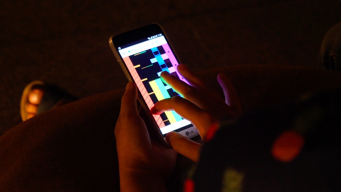Audiences who participate in the performance with their smartphones produce a musical or physical enunciation by forming networks and scrolling webpages. Or, more precisely, they share the acts of enunciating performed by multiple people. Participants are simultaneously the subjects of the enunci ation: reflexive recipients of the sounds, opinions and actions that create a subtle and unlikely ensemble: and the individual mediums of various waves.