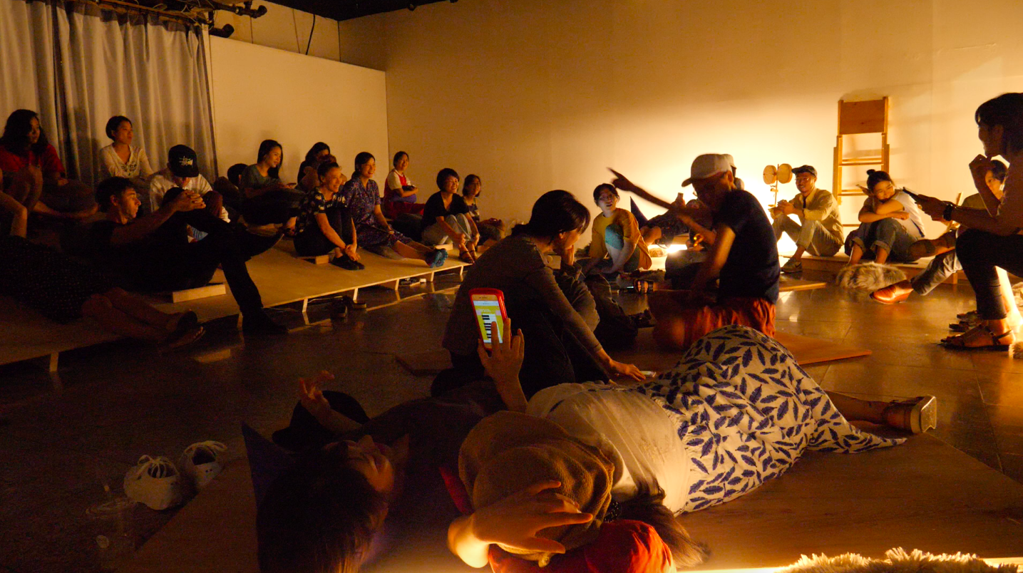 Participatory sound performance, “Round Ensemble attempts at mixing and mashing up the positions, opinions, and attitudes of the performance participants musically, electronically, and even physically. Although this concept may sound grandiose or high-flown, what this meeting expects from the audience is not something grand. It is only asking them to let go of the pragmatic positions and democratic expectations that a well-thought-out conclusion, completed music, or neatly arranged agreement would come out of it. This performance lacks a particular purpose, and is at once a highren tropy festival in which the diverse opinions of the participants lose their ways and wander and hover around, and an endless chatter in which the sounds, signals, gestures, radio waves, and sound waves fly around and compete with one another.
