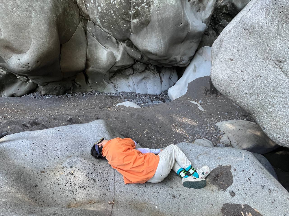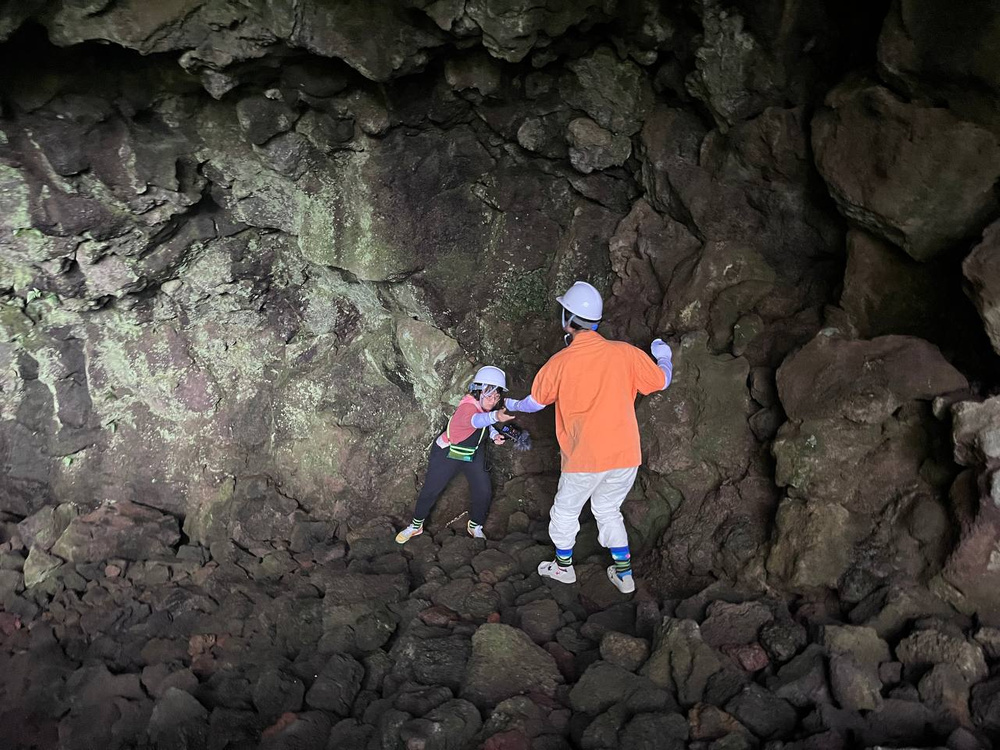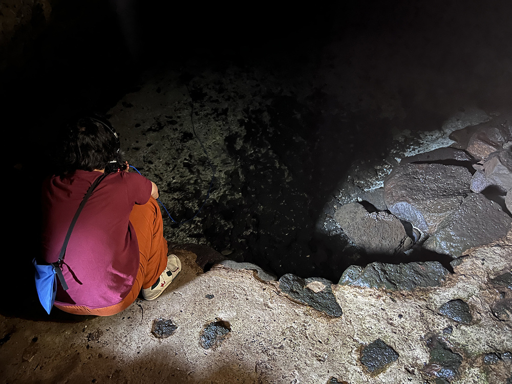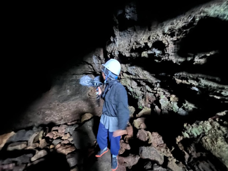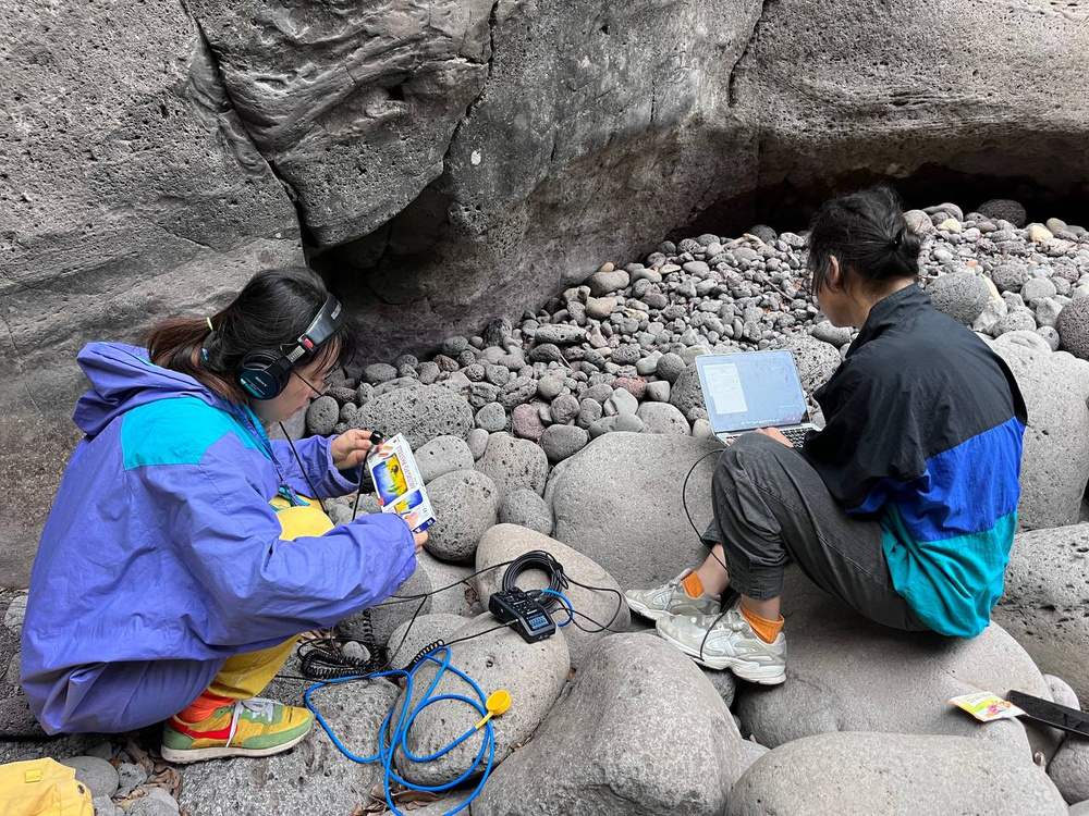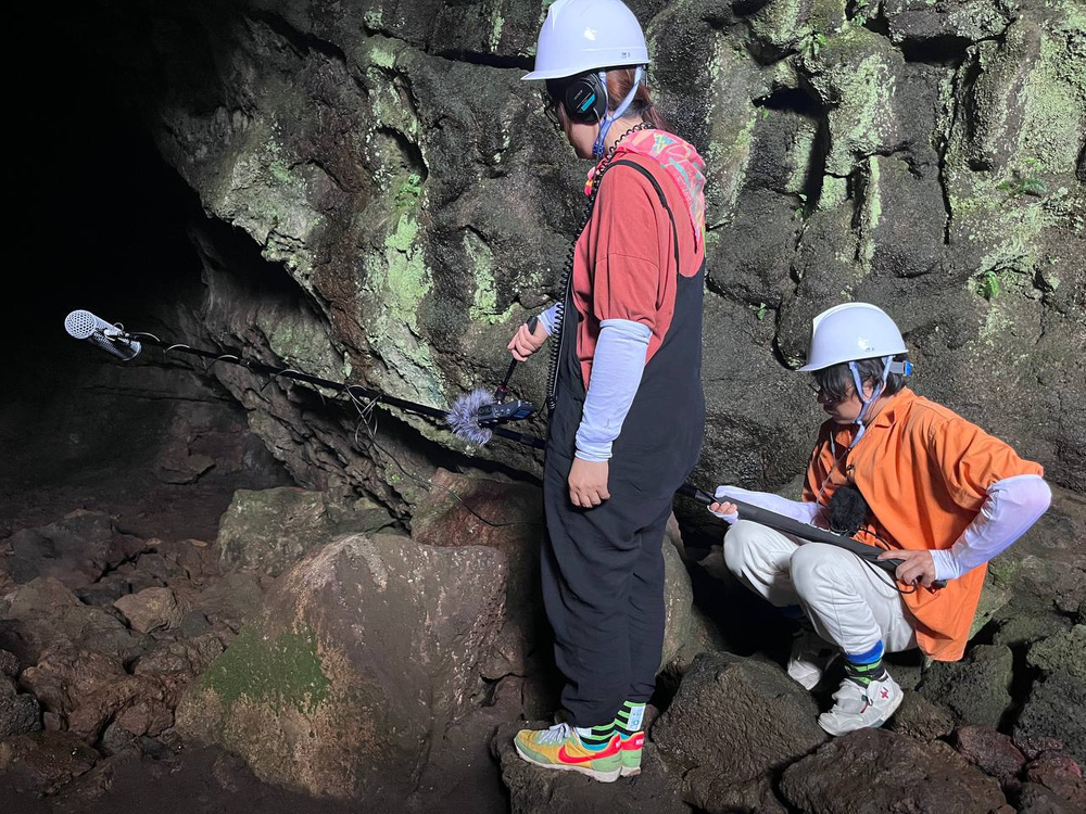 “The participating artists of Unmute Water: A Walk in Oscillation—Diana Band (Shin Wonjung & Yi Dooho), Oro Minkyung, and Grace Kim—conducted six months of field research across Jeju, visiting dry riverbeds, caves, and sumgol. Holding the question, “How can we hear the sound of water beneath the ground?”, they experimented with various bodily senses and listening devices to find ways of connecting with water. The journey of bringing our bodies to water’s domain was also a trembling affirmation of existence. These walks in vibration continue to flow—within the self, within relationships, and within the world—through encounters and frictions with various more-than-human beings.”