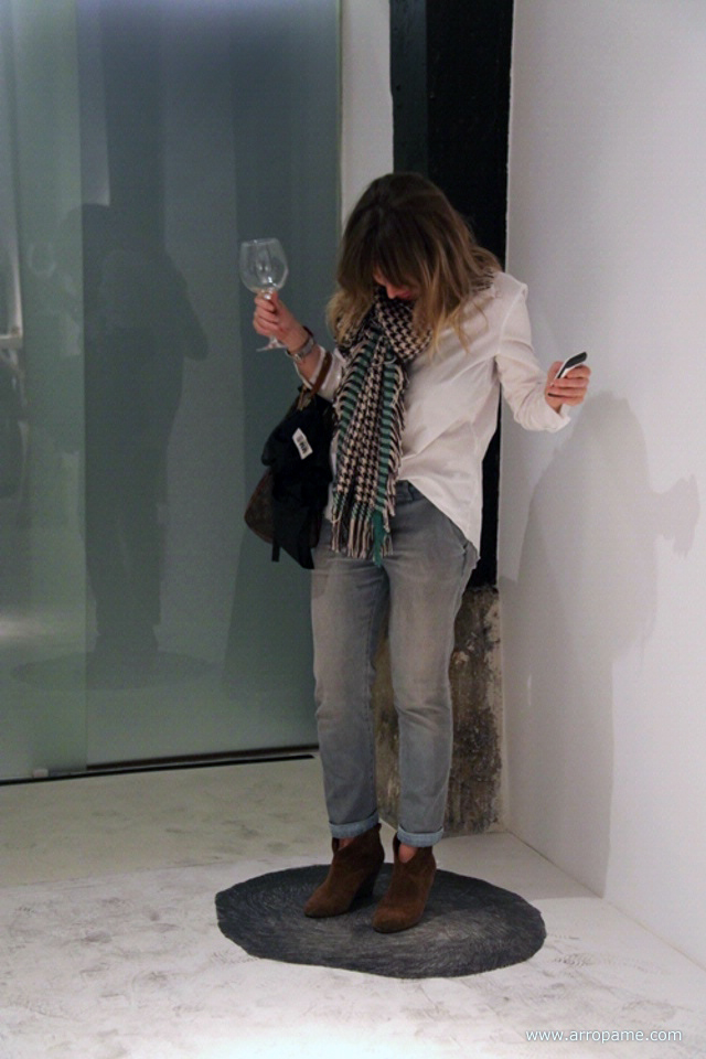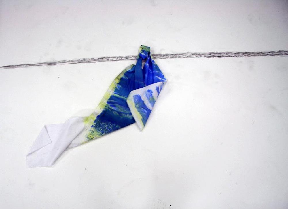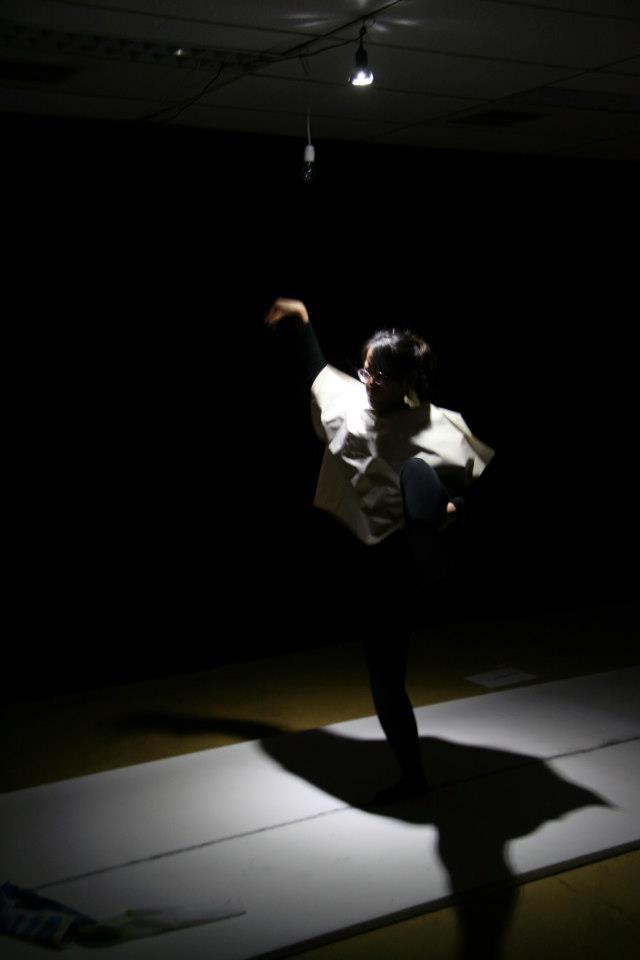 공연자가 종이 옷을 입고, 줄을 타기 시작한다.
