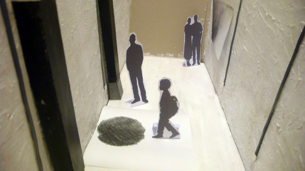 회로가 그려진 종이 세장을 바닥에 펼쳐놓고, 윗장에 커다란 구멍을 그렸다.